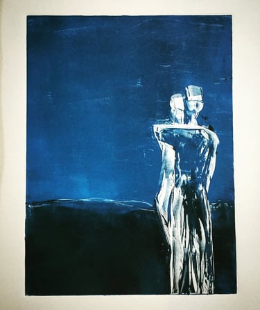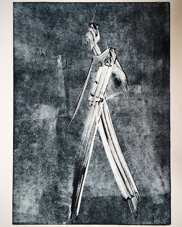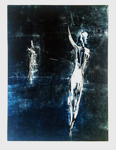 Exploring mono-printing while living in California deepened my insights into acceptance and the practice of letting go. Ink behaves unpredictably. As I etched my figures, I couldn't wait to see the mirrored images looking back at me.